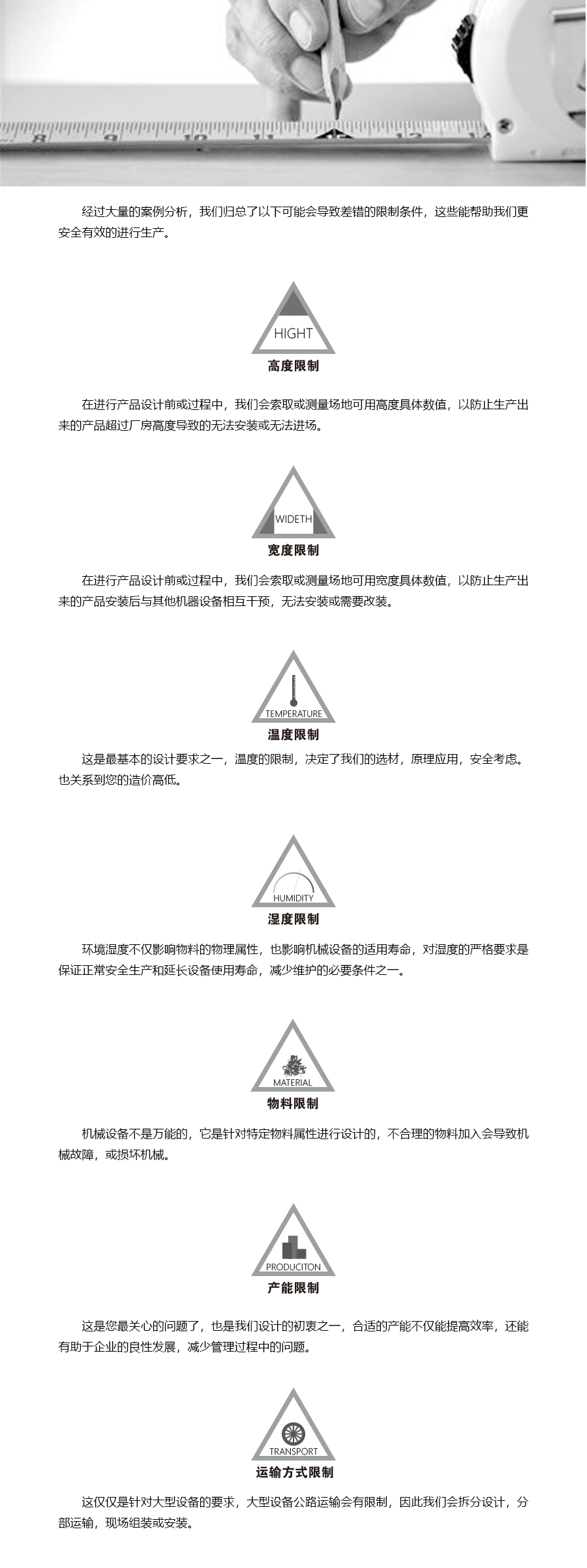 通常在客戶的初始方案要求下,我們對(duì)方案中的材料選用,場(chǎng)地利用,效率預(yù)估,能耗,噪聲等進(jìn)行預(yù)審,有不能滿足的或不能實(shí)現(xiàn)的地方,銷售會(huì)及時(shí)與您溝通,或者實(shí)地考察您的生產(chǎn)環(huán)境,提出合理化的方案,在此列舉部分限制供您參考。