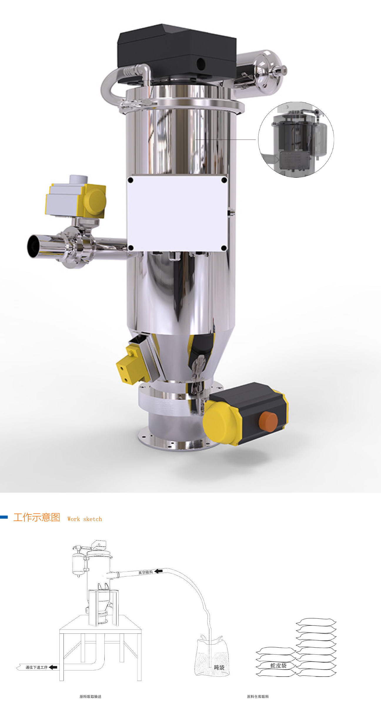 1、氣動控制器控制真空泵啟動,在分離倉內產生真空,迅速將空氣和物料從進料口經軟管或管子從吸料口進入到真空輸送設備中,從而達到輸送物料的目的。