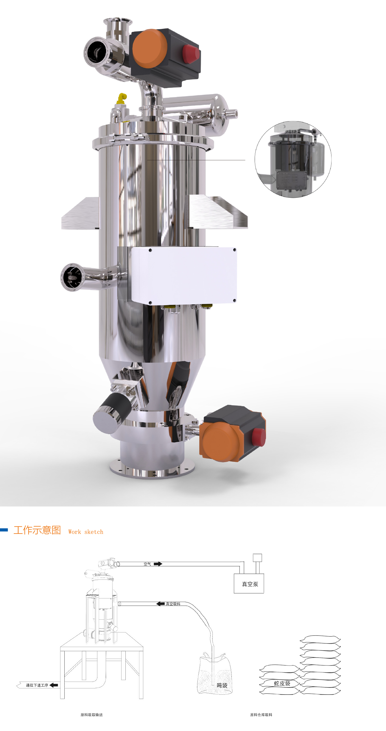 1、氣動控制器控制真空泵啟動,在分離倉內產(chǎn)生真空,迅速將空氣和物料從進料口經(jīng)軟管或管子從吸料口進入到真空輸送設備中,從而達到輸送物料的目的。