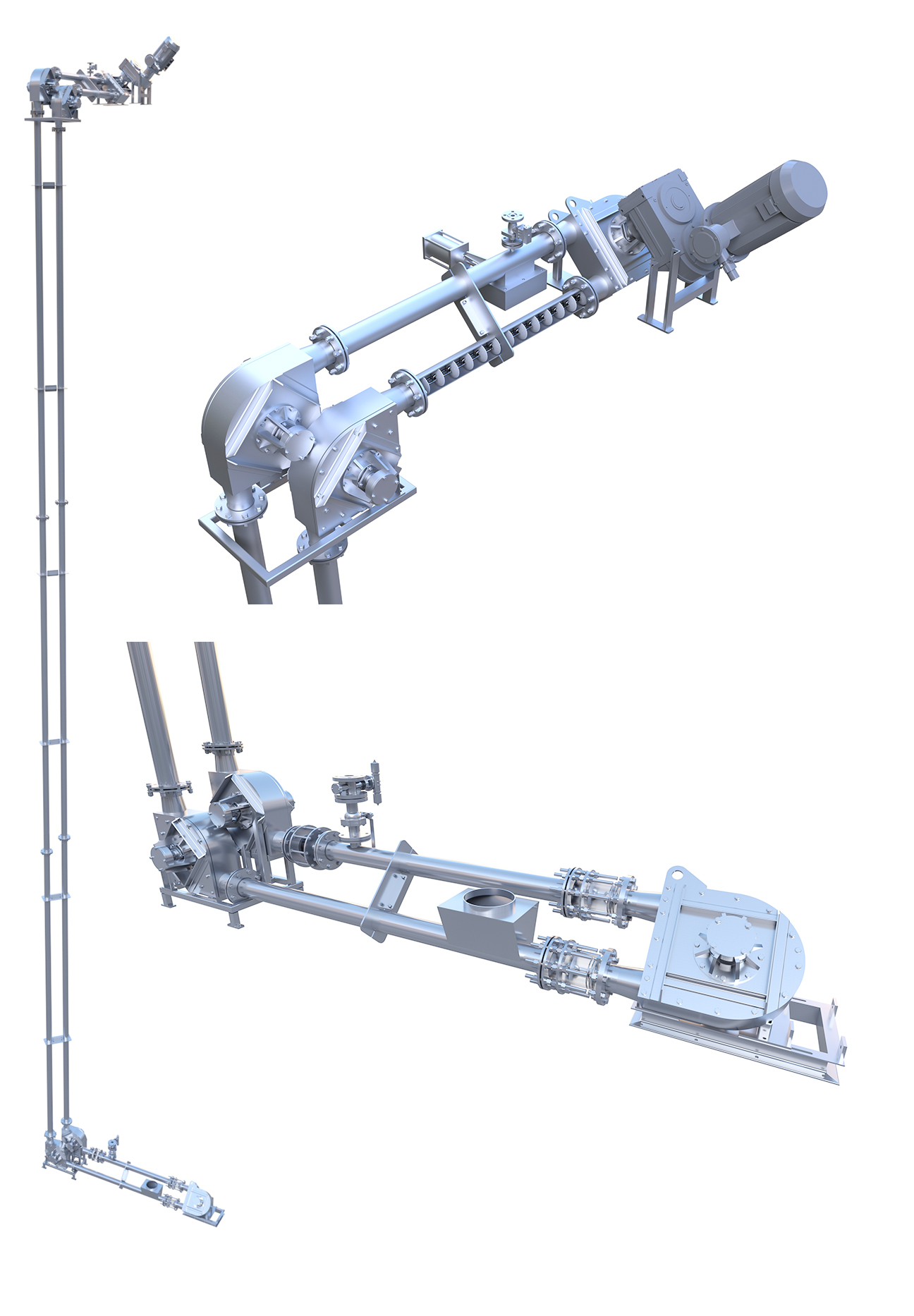 當水平輸送時,物料顆粒受到鏈片在運動方向的推力。當料層間的內摩擦力大于物料與管壁的外摩擦力時,物料就隨鏈片向前運動,形成穩定的料流;當垂直輸送時,管內物料顆粒受鏈片向上推力,因為下部給料阻止上部物料下滑,產生了橫向側壓力,所以增強了物料的內摩擦力,當物料間的內摩擦力大于物料與管內壁外摩擦力及物料自重時,物料就隨鏈片向上輸送,形成連續料流。